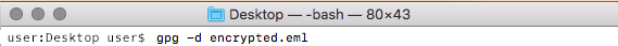 6.Type “gpg -d encrypted.eml”. (Note, if you named your file something else, you can swap it with the “encrypted.eml” text. Be mindful of capitalization and spelling!)